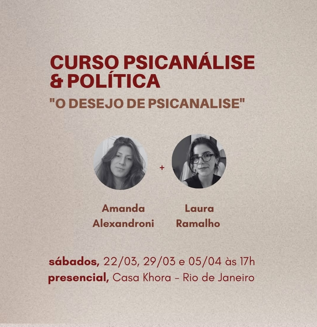 Pensando nessas questões, o curso “Psicanálise e Política: O desejo de psicanálise”, será realizado presencialmente na Casa Khōra entre os sábados 22/03, 29/03 e 05/04 às 17h. O valor é de R$ 100 por encontro, totalizando R$ 300. Para informações sobre bolsas entrar em contato com Amanda Alexandroni (11) 97625-8894 ou Laura Ramalho (24) 99303-8520.