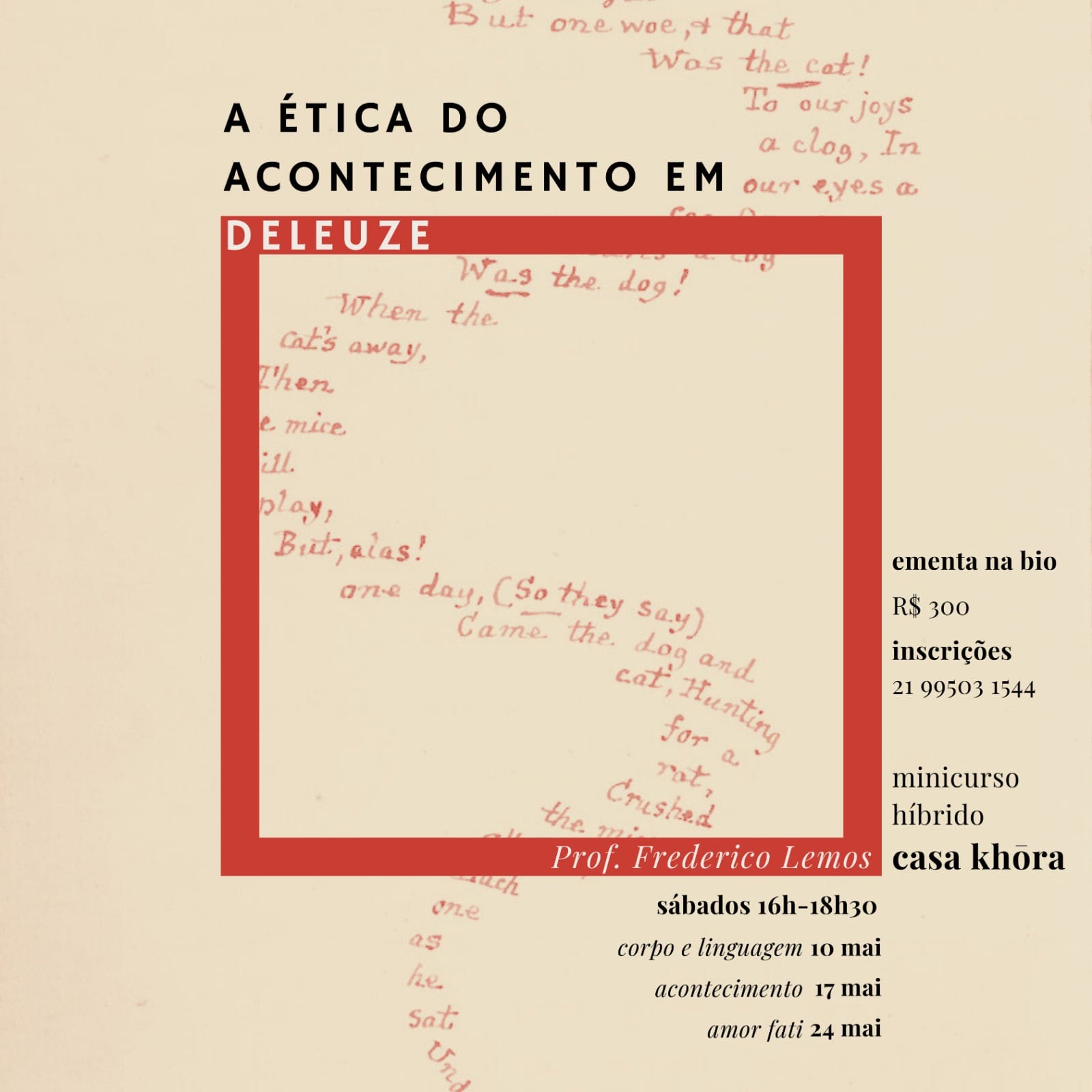 Em clima de comemoração do centenário do filósofo Gilles Deleuze, a Casa Khōra convida o professor Frederico Lemos para ministrar o curso “A ética do acontecimento em Deleuze”. Sua proposta é oferecer uma introdução à ética deleuziana com foco no problema do acontecimento elaborado no livro _Lógica do Sentido_ (1969).
