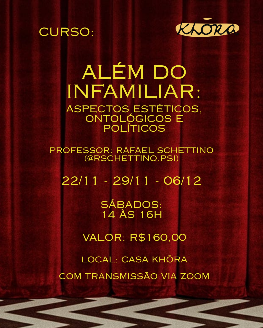 O curso visa propor uma leitura do conceito de infamiliar (Unheimliche) em Freud para além de seu entendimento como uma das formas do recalcado que retorna, explorando novos desdobramentos. Se a solução de Freud ao final de seu ensaio foi tão medíocre como qualquer solução insatisfatória para um caso misterioso – como diz Mark Fisher – propomos realizar uma chave de leitura do conceito como Cixous nos propõe: como algo sempre à margem de outra coisa. Através da análise da experiência estética e psicanalitica do infamiliar, argumentaremos que ele não se reduz a uma forma de reconhecimento do já sabido e recalcado, mas, sim, como um operador de um ponto de ruptura que evidencia a fragilidade do Eu e do princípio de realidade. Investigaremos como o infamiliar produz um saber que escapa à lógica binária do recalque e seu retorno, desestabilizando as fronteiras entre o dentro e o fora, o conhecido e o estranho. Adicionalmente, ao trazermos para a cena o encontro com o que não pode ser plenamente simbolizado, apresentamos dois conceitos de Mark Fisher que complementam a leitura não feita por Freud, para pensar o infamiliar como operador estético e ontológico – o que abre espaço para uma concepção de experiência que escapa aos processos de homeostase psíquico que atribuem valor à realidade, explorando ao longo do curso as dimensões estéticas, políticas e ontológicas que serão possíveis de serem desdobradas à partir da nossa releitura conceitual.